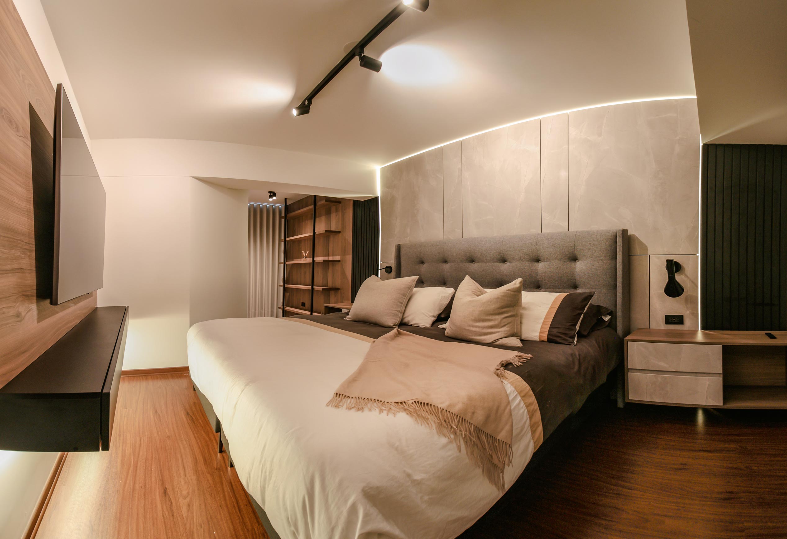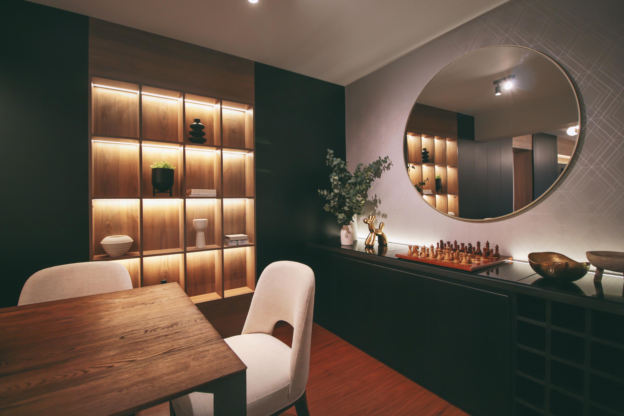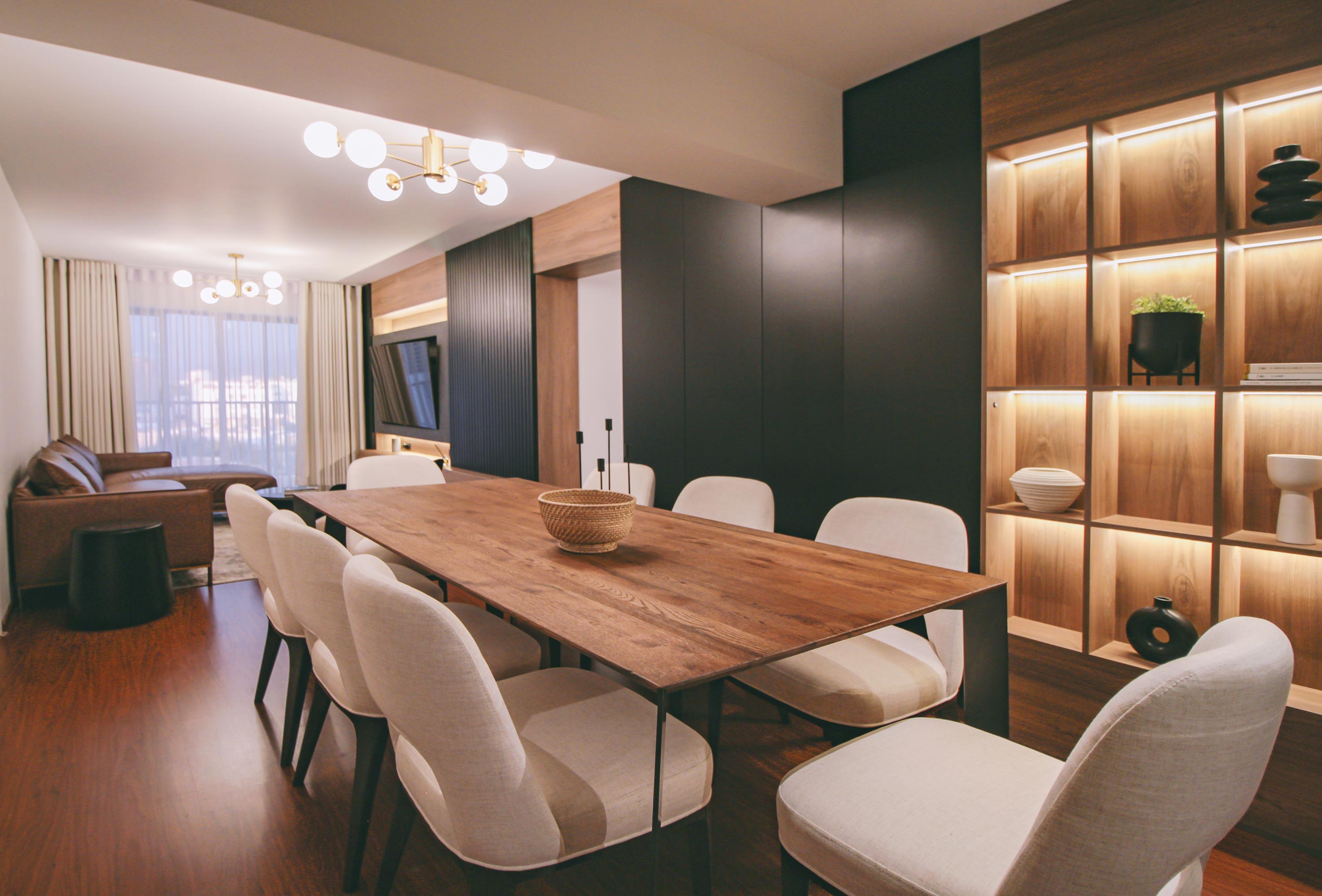Propuesta de interiorismo para departamento en Miraflores. El diseño fue pensado para una pareja joven, que además de tener espacios funcionales para sus eventos sociales, también se dedico un espacio de trabajo super personalizado en base a los hobbies de uno de ellos.