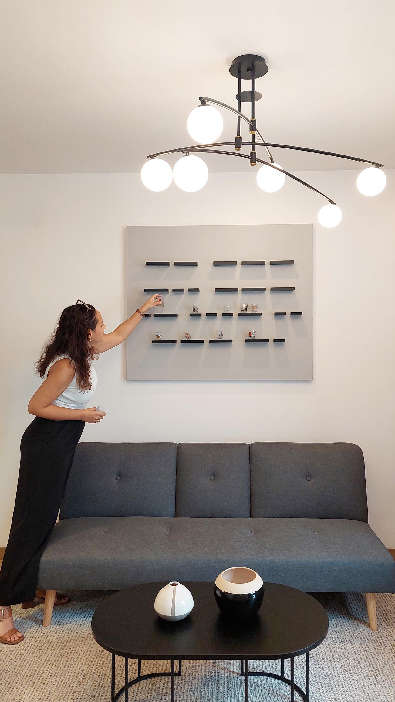 Propuesta de diseño para un dpto de 45m2 en San Isidro. La propuesta se inspiró en el hobbie principal del cliente que eran sus viajes por el mundo. El enfoque principal del espacio fue resaltar esta actividad pero desde una perspectiva más contemplativa. El punto focal de la sala es el cuadro central. Las pequeñas repisas además de exhibir la colección de vasos de shots de las distintas ciudades a las que viajó, esconden un mensaje oculto en código morse con la frase "Modo Avión".